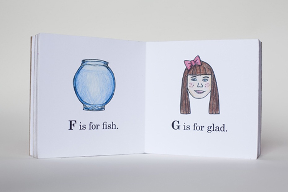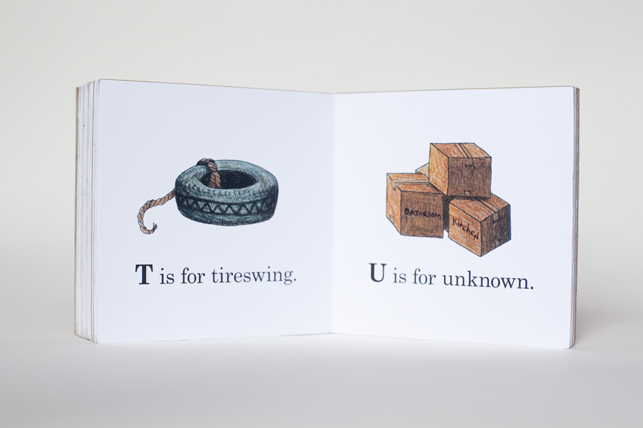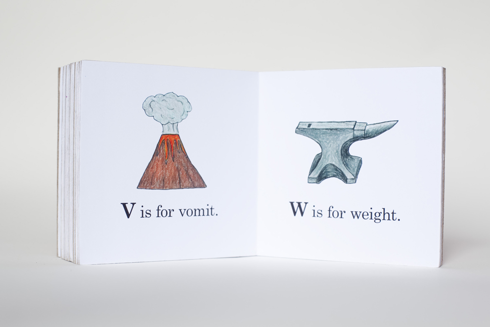 ABKey is the first book of the Ripe series. This children’s board book juxtaposes child playthings with adult world issues, creating an at times humorous, but also uneasy realm for the viewer. “A is for apple, B is for bruise, C is for cheater, D is for divorce…V is for vomit, W is for weight, X is for the words I can’t repeat.”